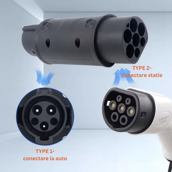 Un adaptor TYPE 2 către TYPE 1 (sau invers) este un accesoriu foarte util atunci când ai schimbat o mașină electrică cu un alt tip de port de încărcare, dar deții deja o stație de încărcare cu o mufă diferită. Mufa TYPE 1 este de obicei mai rotundă și are 5 pini, fiind mai des întâlnită la modelele mai vechi sau de proveniență nord-americană și asiatică. Mufa TYPE 2 este mai plată, cu 7 pini, și este standardul în Europa. Un adaptor cu o stație de încărcare TYPE 1 conectată la mașină va permite încărcarea monofazică la o putere maximă de 32A (7.2kW). Aceste adaptoare sunt compacte și oferă o soluție practică pentru a asigura compatibilitatea între stația ta de încărcare și noul tău vehicul electric.