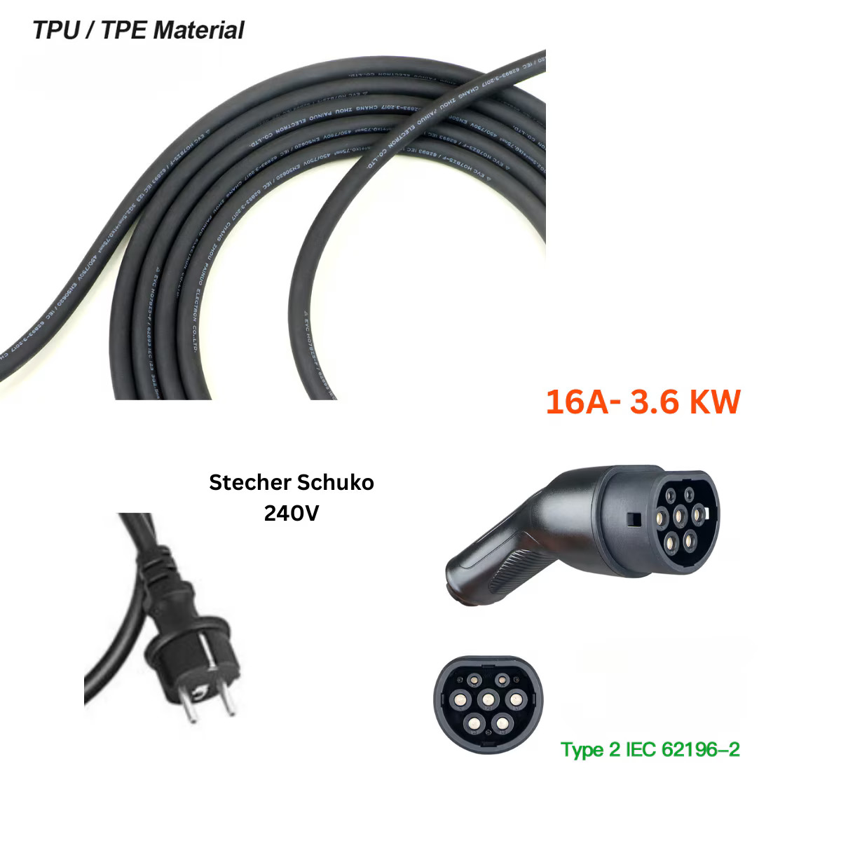 Cu adaptor type 2 sau type 1 pe partea de conectică auto, dar și Schuko, Red CEE (trifazat) sau Blue CEE (monofazat) garantăm compatibilitatea cu protocolul de încărcare al mașinii tale.