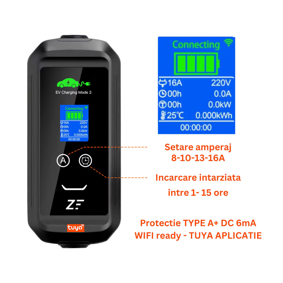 Încărcătorul se conectează simplu la rețeaua Wi-Fi prin intermediul aplicației TUYA. Odată conectat, aplicația îți permite să monitorizezi și să controlezi procesul de încărcare de la distanță, inclusiv selectarea puterii de încărcare (amperaj) cu o precizie de 1A (de la 8A + 1A în sus), programarea pornirii întârziate și vizualizarea datelor de încărcare.