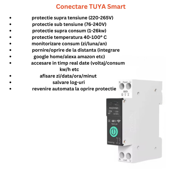 Se instaleaza foarte simplu in aplicatia TUYA si aveti control la distanta de oriunde pentru monitorizare consum, setari supra/sub tensiune, temperatura etc.