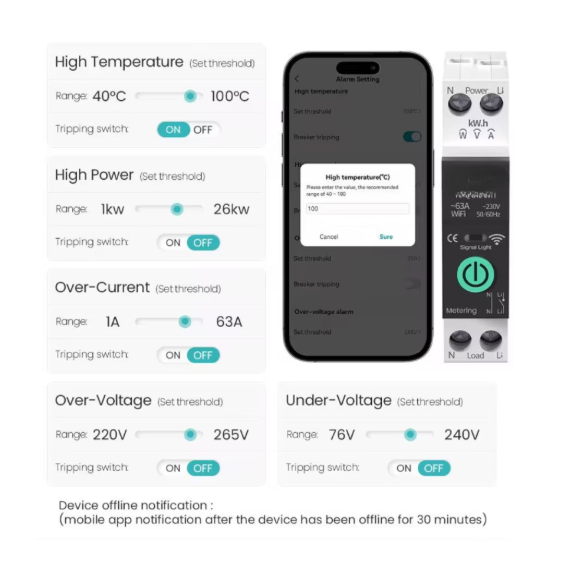 Dispozitivul de protectie reglabil pentru tensiune si curent cu contor de kilowati-ora este un protector inteligent integrat cu protector de supratensiune, protector de subtensiune si protector de supracurent, cu conectare TUYA, wifi.